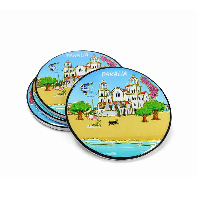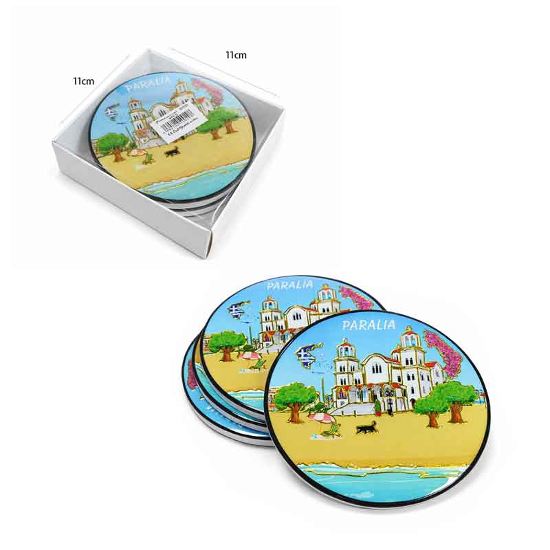 Σετ στρογγυλά σουβέρ με παράσταση εμπνευσμένη από την ελληνική παραλία και το χαρακτηριστικό νησιώτικο τοπίο. Το σχέδιο απεικονίζει εκκλησία δίπλα στη θάλασσα, δέντρα, καλοκαιρινή ατμόσφαιρα και την ελληνική σημαία, δημιουργώντας μια όμορφη εικόνα που θυμίζει διακοπές στην Ελλάδα.