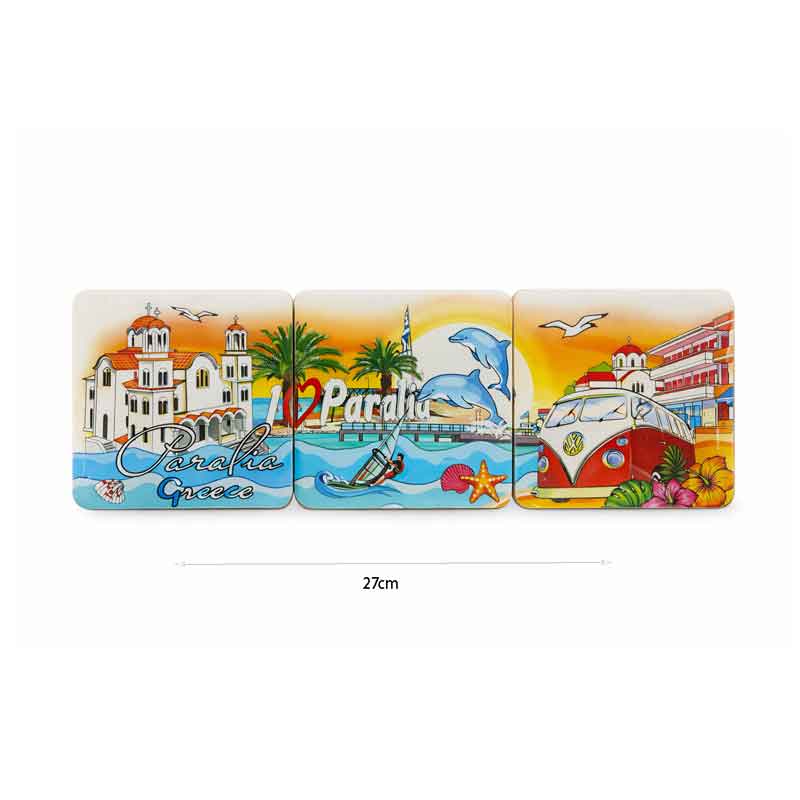Σετ από 3 σουβέρ με θέμα την Παραλία , εμπνευσμένα από το γραφικό τοπίο και την καλοκαιρινή ατμόσφαιρα της περιοχής. Τα σχέδια απεικονίζουν χαρακτηριστικά στοιχεία όπως παραδοσιακή εκκλησία, θαλασσινά μοτίβα με δελφίνια και κοχύλια, καθώς και το εμβληματικό βανάκι σε παραθαλάσσιο σκηνικό. Με έντονα χρώματα και καλοκαιρινή διάθεση, αποτελούν ιδανική επιλογή για καθημερινή χρήση ή ως αναμνηστικό δώρο. Κατασκευασμένα από ανθεκτικά υλικά, προστατεύουν τις επιφάνειες από λεκέδες και θερμότητα, προσθέτοντας μια όμορφη ελληνική πινελιά στον χώρο σας.
