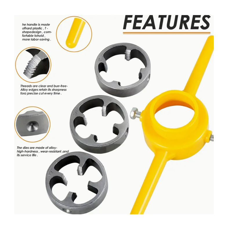 Οι μήτρες είναι κατασκευασμένες από υλικό κράματος και η λαβή είναι από σκληρό πλαστικό, με υψηλή σκληρότητα, αντοχή στη φθορά και μεγάλη διάρκεια ζωής. Με καλή υφή και λεπτή κατασκευή, τα νήματα είναι καθαρά και η επιφάνεια είναι λεία χωρίς γρέζια, προστατεύοντας τα χέρια σας και παρέχοντας ασφαλή και άνετη χρήση. Το πρότυπο νήματος είναι NPT.