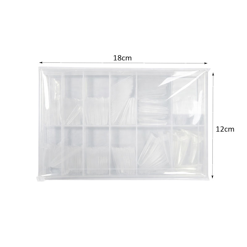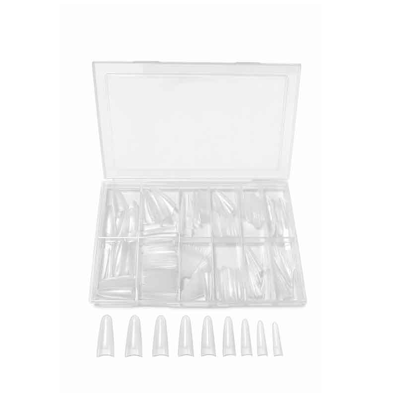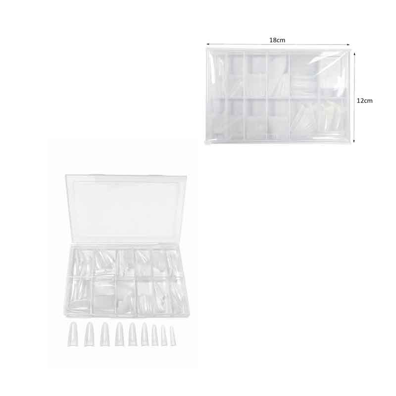 Πρακτικό σετ τεχνητών νυχιών σε αμυγδαλωτό σχήμα, τοποθετημένα σε διαφανές πλαστικό κουτί αποθήκευσης με χωρίσματα για εύκολη οργάνωση και επιλογή μεγέθους. Το κουτί διαθέτει συμπαγή κατασκευή και προστατευτική συσκευασία, ιδανική για ασφαλή αποθήκευση και μεταφορά.