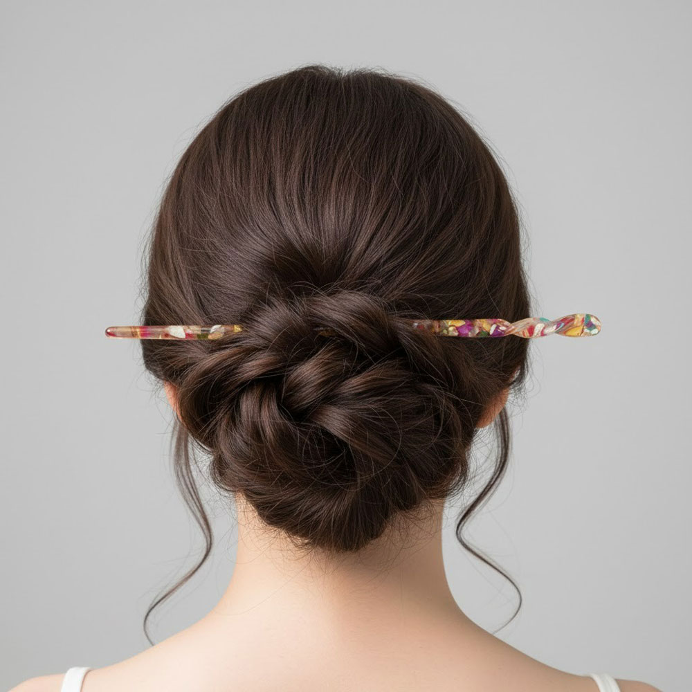 Κομψό στικ μαλλιών με πολύχρωμο marble σχέδιο που χαρίζει ιδιαίτερο χαρακτήρα και artistic αισθητική σε κάθε χτένισμα. Το minimal και λεπτό design επιτρέπει εύκολη και σταθερή εφαρμογή, ιδανικό για χαμηλούς κότσους, πλεξούδες και elegant updos.