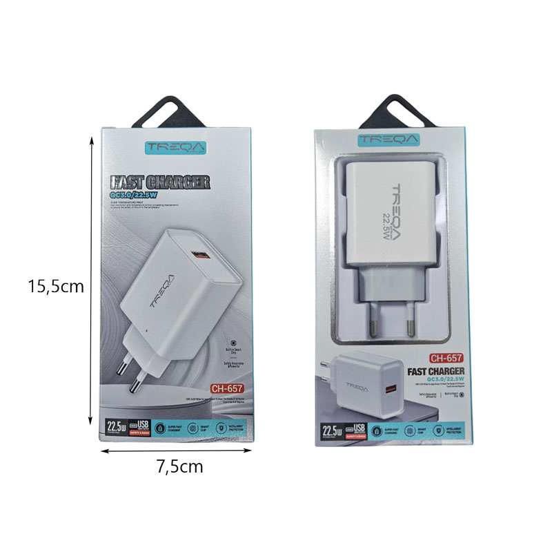 Ο Treqa CH-657 είναι ένας φορτιστής ταχείας φόρτισης 22.5W, ιδανικός για χρήστες που απαιτούν γρήγορη και ασφαλή φόρτιση σε καθημερινή βάση. Με θύρα USB και σύστημα προστασίας από υπερθέρμανση, εξασφαλίζει αξιόπιστη λειτουργία για κινητά, tablets και άλλες ηλεκτρονικές συσκευές.