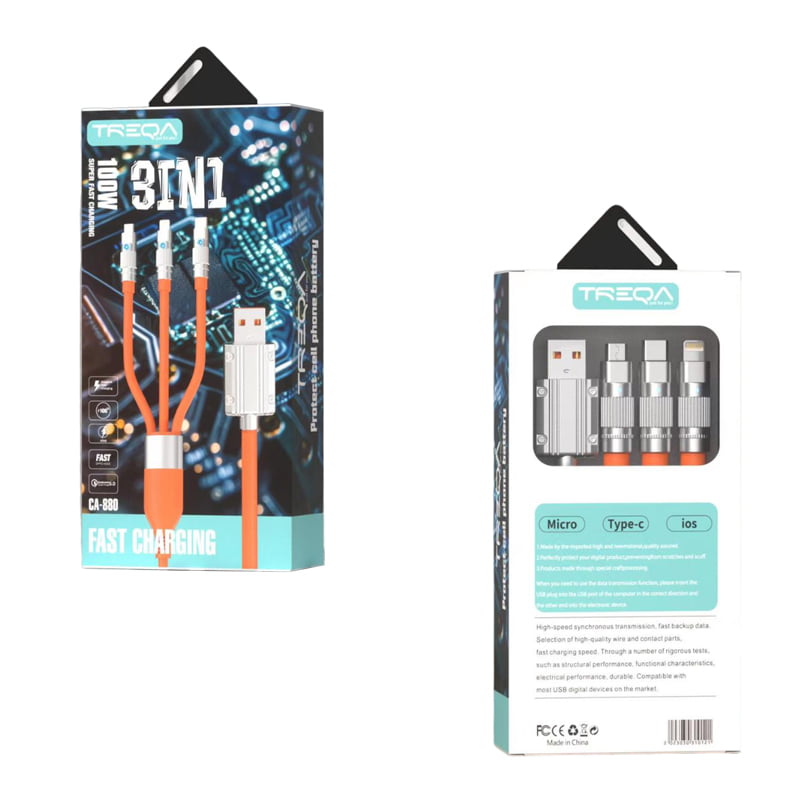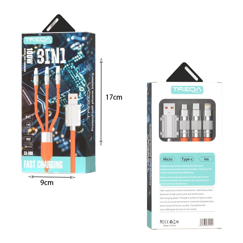 Το Treqa Καλώδια δεδομένων για γρήγορη φόρτιση 3 σε 1 CA-880 100W είναι ένα καλώδιο ιδανικό για γρήγορη φόρτιση και μεταφορά δεδομένων. Συμβατό με ολες τις συσκευασίες καθώς διαθέτει 3 καλώδια Type-C, Micro-USB και Lightning-IOS.