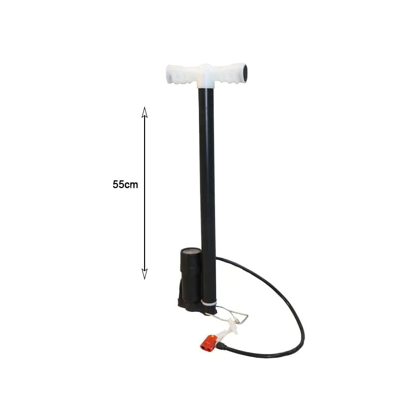 Όρθια τρόμπα χειρός με λαβή για φούσκωμα ελαστικών ποδηλάτων, αυτοκινήτων κ.α. Διαθέτει μανόμετρο και ακροφύσια για σωσίβια, στρώματα κτλ.