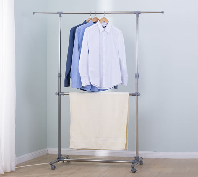 Τροχήλατη κρεμάστρα δαπέδου διπλή πολλαπλών χρήσεων, ιδανική ως έπιπλο εισόδου ή ως απλώστρα ρούχων. Μεταλλικός σκελετός. Ρυθμιζόμενο ύψος και μήκος βέργας. Διαστάσεις: 100-165 x 48 x 115-180 cm.