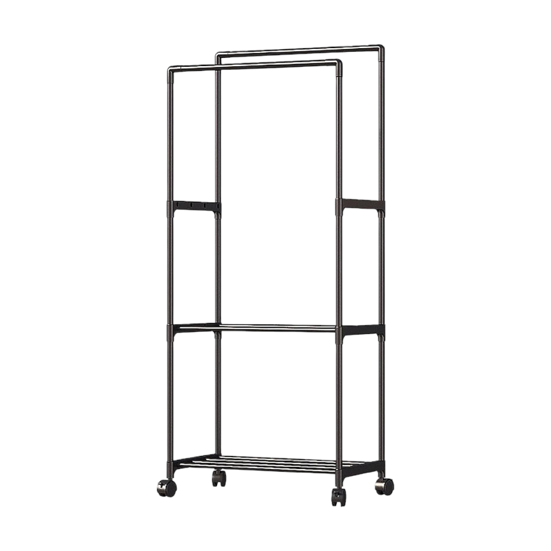 Τροχήλατη κρεμάστρα δαπέδου διπλή με 2 ράφια πολλαπλών χρήσεων, ιδανική ως έπιπλο εισόδου ή για την οργάνωση των ρούχων στο δωμάτιό σας .