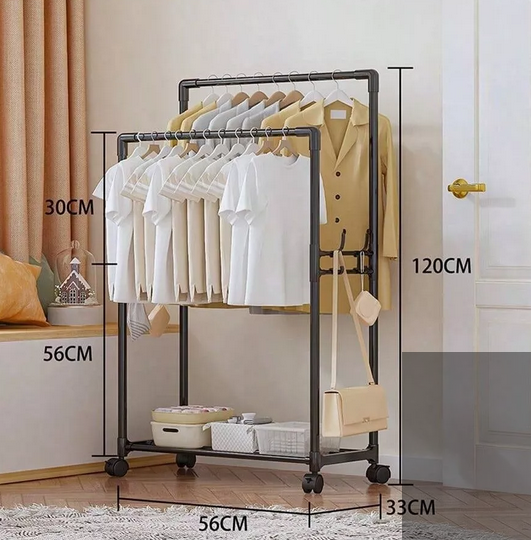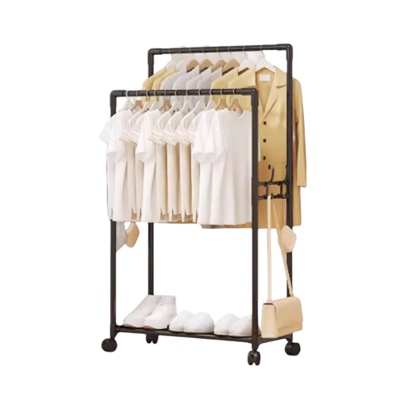 Τροχήλατη κρεμάστρα δαπέδου μεταλλική, με ράφι παπουτσιών και πλαϊνές κρεμάστρες, ιδανική ως έπιπλο εισόδου ή για την οργάνωση των ρούχων στο δωμάτιό σας.
