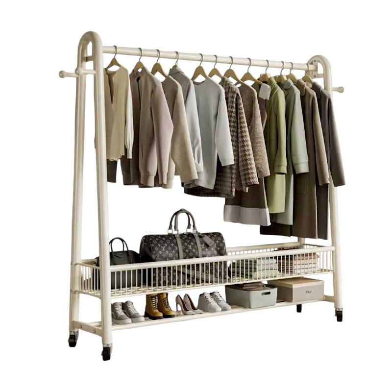 Τροχήλατη κρεμάστρα δαπέδου μεταλλική, με 2 ράφια παπουτσιών και αξεσουάρ, ιδανική ως έπιπλο εισόδου ή για την οργάνωση των ρούχων στο δωμάτιό σας.