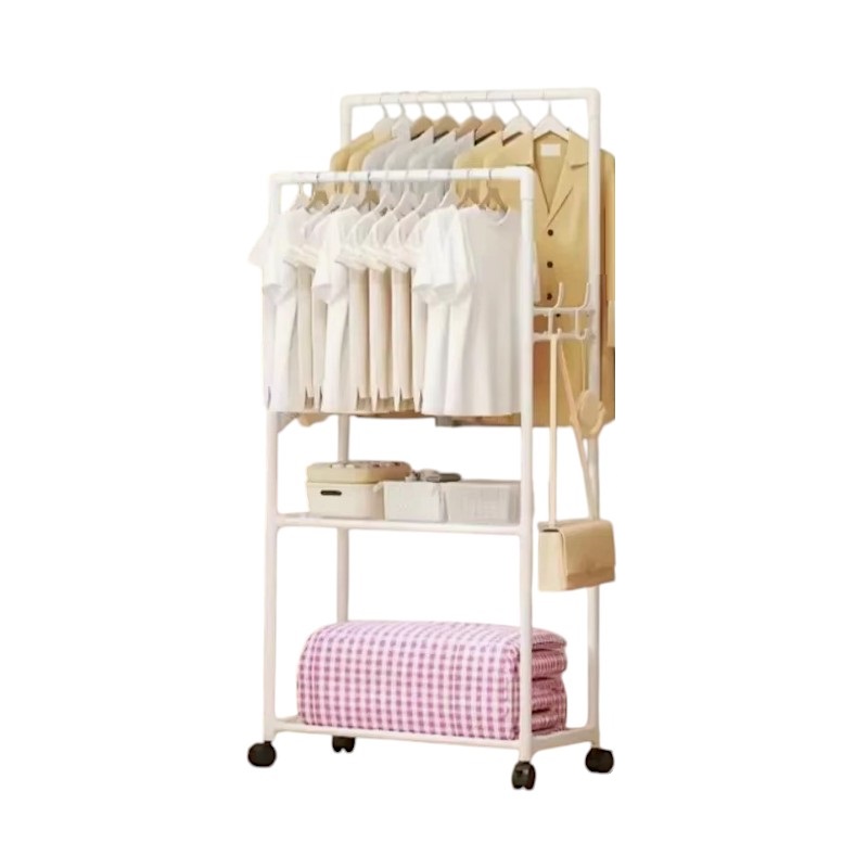 Τροχήλατη κρεμάστρα δαπέδου μεταλλική, με 2 ράφια και πλαϊνές κρεμάστρες, ιδανική ως έπιπλο εισόδου ή για την οργάνωση των ρούχων στο δωμάτιό σας.