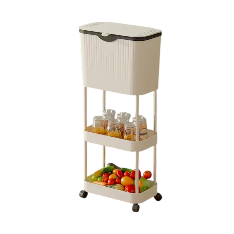 Tροχήλατο καρότσι οργάνωσης κουζίνας τριών επιπέδων με ενσωματωμένο κάδο απορριμμάτων.