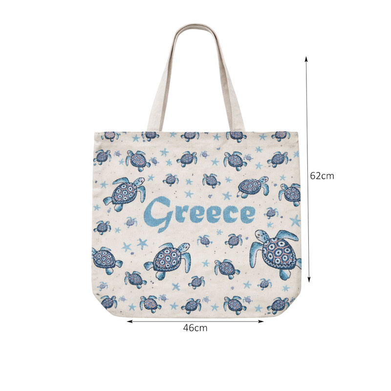 Καλοκαιρινή υφασμάτινη τσάντα θαλάσσης με χαρούμενο σχέδιο χελώνες και την επιγραφή Greece στο κέντρο. Το μοτίβο με θαλάσσια στοιχεία και γαλάζιες αποχρώσεις αποπνέει ελληνικό καλοκαιρινό ύφος, ιδανικό για παραλία και διακοπές.