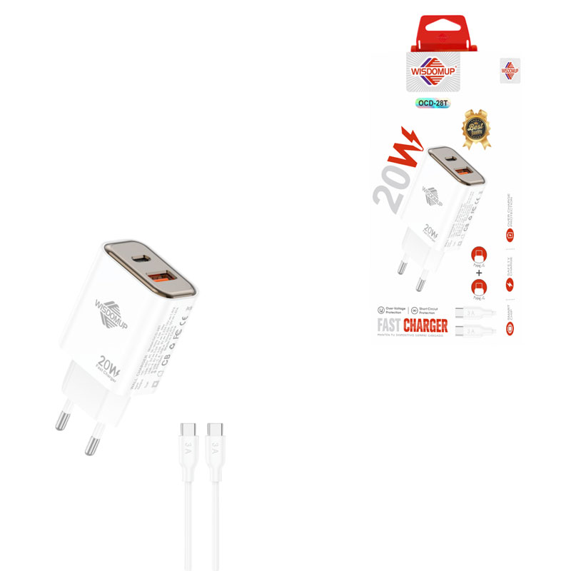 Φορτιστής ταχείας φόρτισης 20W, ιδανικός για καθημερινή χρήση στο σπίτι, το γραφείο ή το ταξίδι. Διαθέτει διπλή έξοδο USB και Type C, επιτρέποντας τη φόρτιση διαφορετικών συσκευών με υψηλή ταχύτητα και ασφάλεια. Συνοδεύεται από καλώδιο Type C σε Type C, προσφέροντας ολοκληρωμένη λύση φόρτισης χωρίς επιπλέον αγορές.