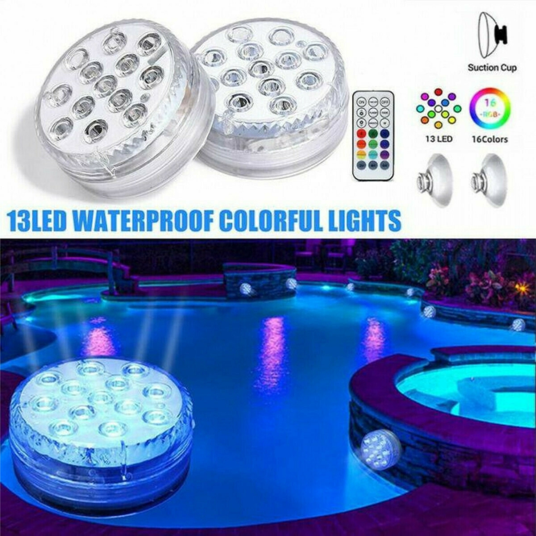 LED υποβρύχιο φως πισίνας. Διαθέτει τηλεχειριστήριο. Ιδανικό για τη διακόσμηση της πισίνας σας και άλλων χώρων μέσα και έξω από το σπίτι σας. Διαθέτει 13 φώτα LED και διατίθεται σε 16 διαφορετικά χρώματα.